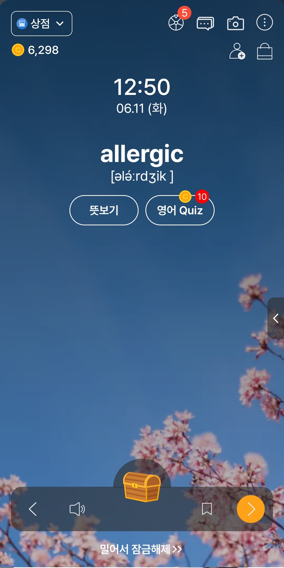 잠금 화면으로 사용하면서 하단에 화살표를 누르면 하루에 20개 정도의 단어를 보면 1개 보석상자를 얻을 수 있어요.