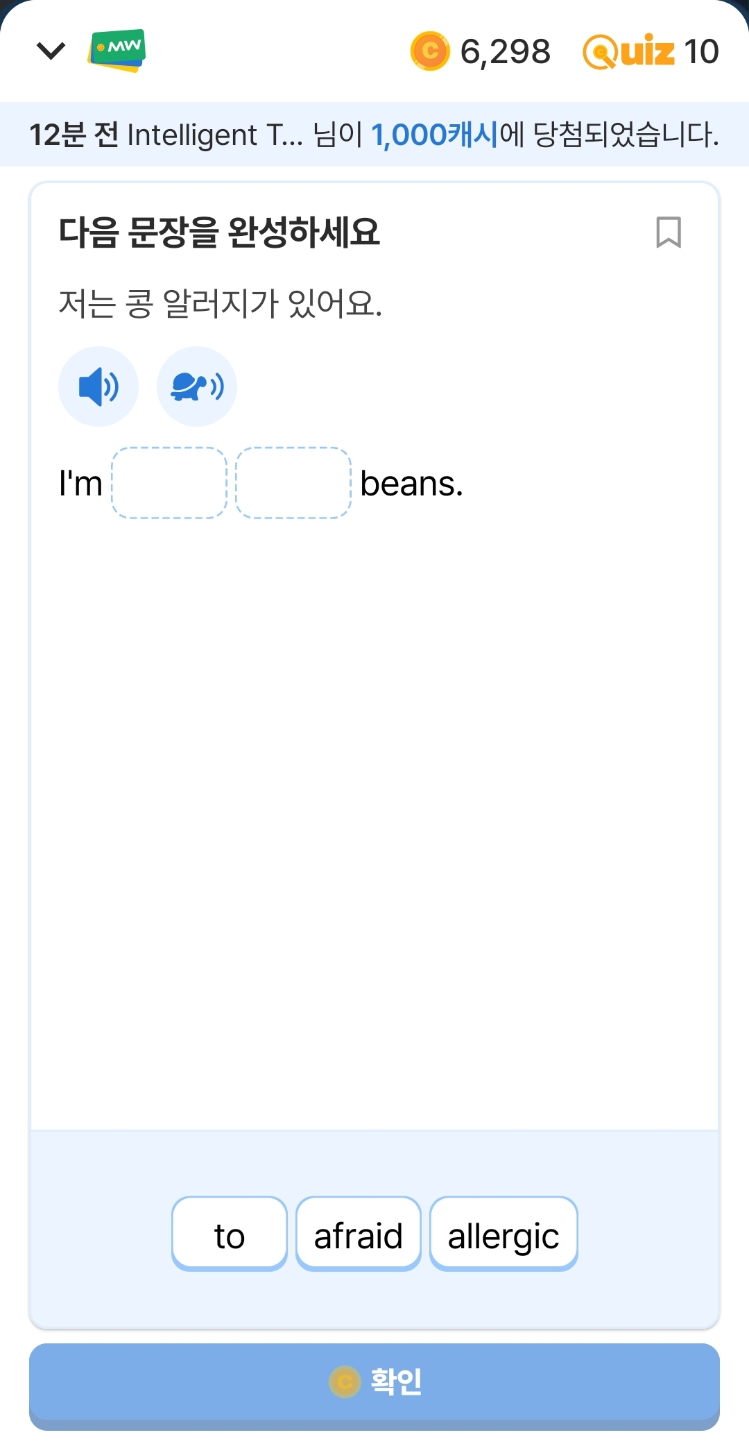 원래 단어만 맞추는 거였는데, 이제 단어 맞추고 문장을 읽으면 한번 더 받을 수 있어서