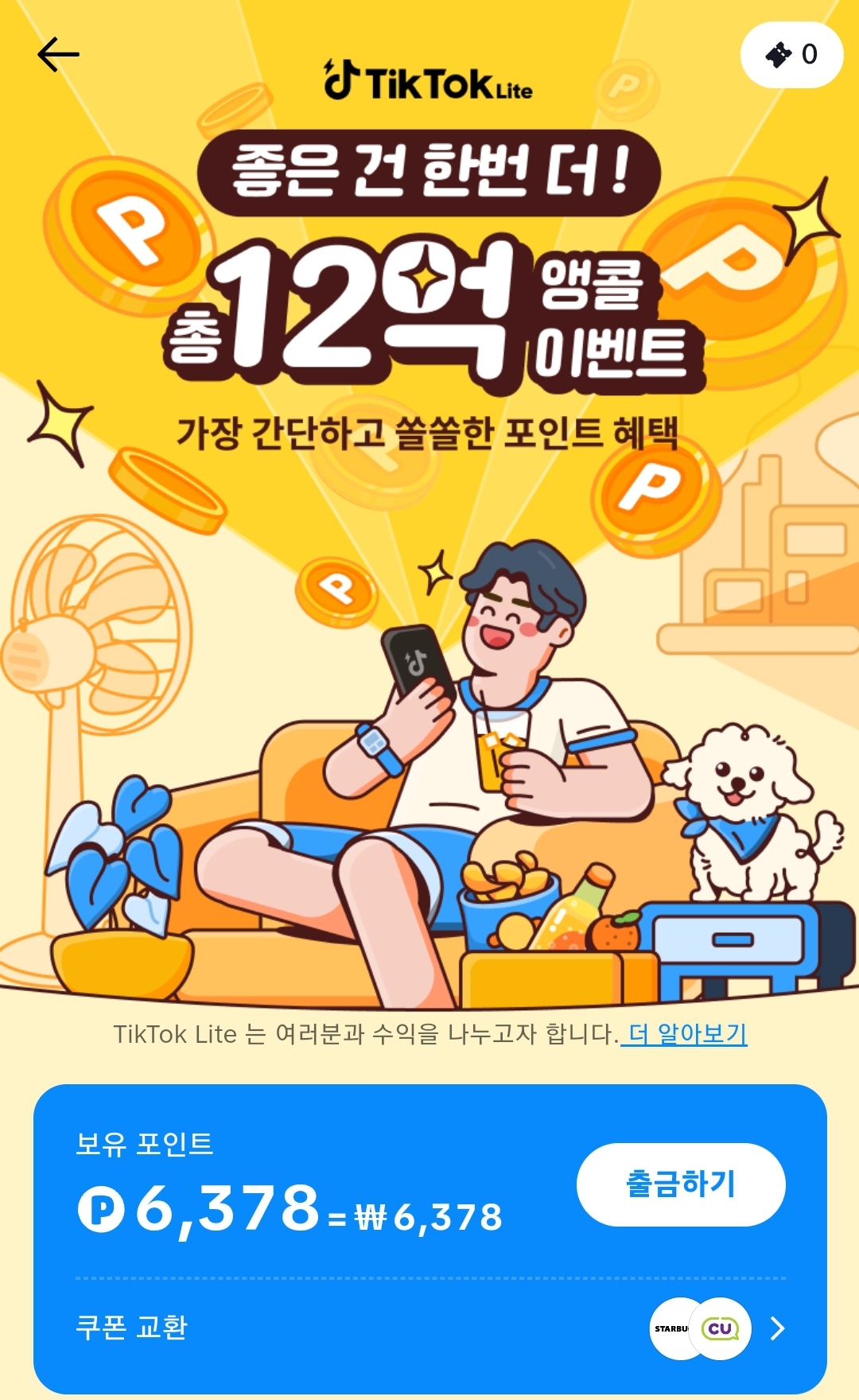 틱톡 라이트 들어가서 맨 하단 중간 포인트를 누르면 이벤트를 확인할 수 있어요.